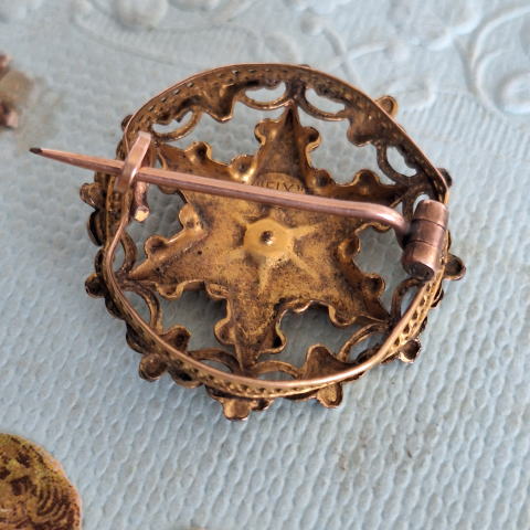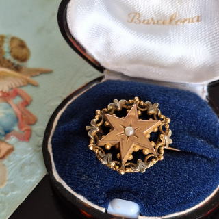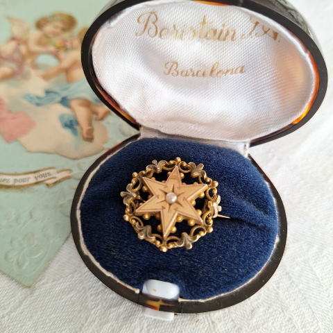 | 元々はキリスト教に由来する物ですが、1900年前後は欧州の天体ブームにより 星や月といったデザイン的にも美しいモチーフはアクセサリーに多用され FIX社もアールヌーヴォーの流れから天体モチーフを沢山作り出しました。 金色の六芒星(ダビデの星)と中央に白く輝くパール周囲はゴールドが施され フリルドレスのような囲いに散りばめられた小さな金の粒の星 それは目に美しく輝きます。 ブローチは目立つようなダメージもなくピンのかかりもしっかりとしています。 裏側にFIX社の刻印あり(ケースは非売品) ★FIX社は1800年創業のブランドで従来のゴールドプレートよりも厚みがあり 耐久性に優れている高品質のジュエリーとして当時とても人気を博し様々な品が作られました。 デザイン性の高さとその美しさから現在でもコレクターが多い商品でもあります。 ※ご希望により特定記録付き定形外郵便(追跡あり、保証なし) 又は一番お安いコンパクト宅急便(追跡、保証あり)でお送りします。 |