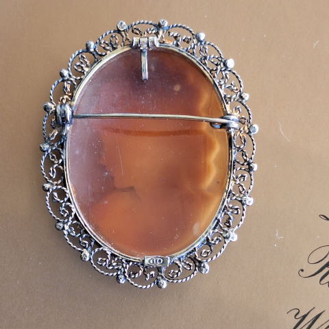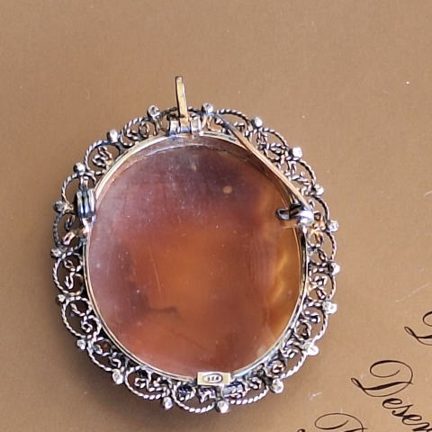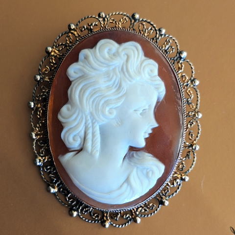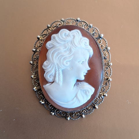 | 希少な濃褐色のブラウン色のシェルの背景に幼なさげな少女の横顔が可愛らしい白っぽいカメオです。 クリクリとした巻き毛に愛らしい目と口元 シェルの艶やかさと天然素材特湯の温かみがより引き立たせているようです シェルのフレームは透かし模様のゴールドシルバー 裏側に「925」のシルバーの刻印が入っています 冬の贈り物として、また自分へのご褒美にぜひお奨めします。 フレームの一部が光線の具合で黒く見えていますが、実物は綺麗でダメージはありません。 ※ご希望により特定記録付き定形外郵便(追跡あり、保証なし) 又は一番お安いコンパクト宅急便(追跡、保証あり)でお送りします。 |
