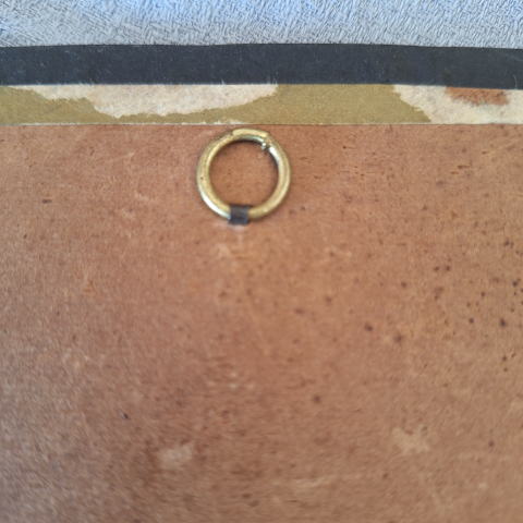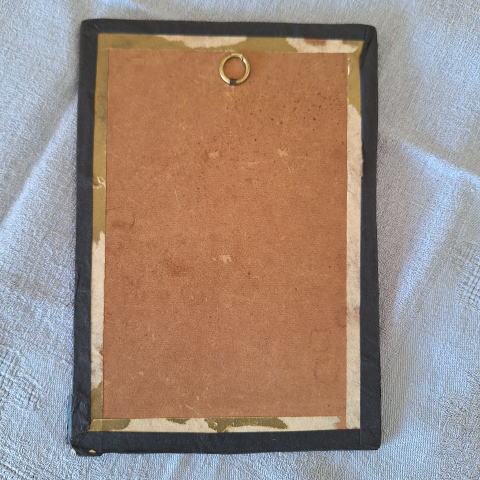 古いメタルの額縁でガラス入りで壁に掛けるフックがついています。