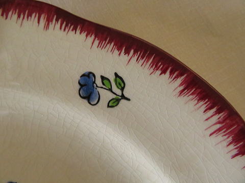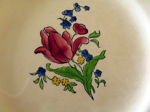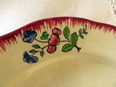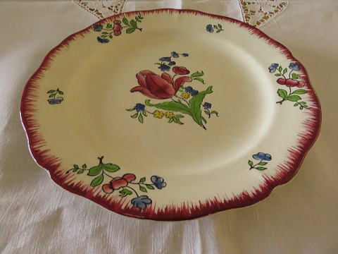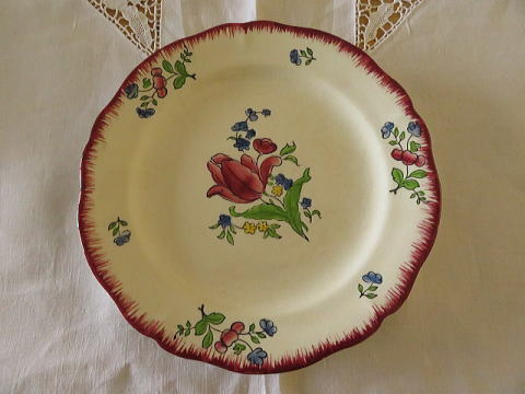 | ジアンのロレーヌシリーズのケーキプレートです。 ケーキプレートと言っても22cmのサイズですからパン皿や一人分の平皿として使い勝手はいいです。 フランスの陶器メーカージアン(Gien)のアンティークのお皿 手描きのチューリップがデザインされていて、その周りに青と黄色の勿忘草の花の蕾が描かれています リムはバーガンディ色で波打つような形状で、裏印には「Exe’cute' a la main」手描きと書かれています。 よく見ると全体に貫入は見られますが、欠け、ラインなしのとても綺麗な状態です。 アンティークのお品たちは経年愛され受け継がれ、海を渡ってお迎えした大切なモノたちです。 製造上どんな器にも貫入やシミが多少あるのは普通の事ですのでご理解いただけるようにお願いします。  |